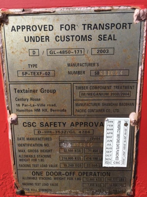 PRODUCT SPECIFICATIONSExternal Length (m)12.19External Width (m)2.44External Height (m)2.59Internal Length (m)12.03Internal Width (m)2.35Door Width (m)2.34Door Height (m)2.28Weight (kg)4050Floor Type28mm Marine PlyCubic Capacity (cubic feet)2358